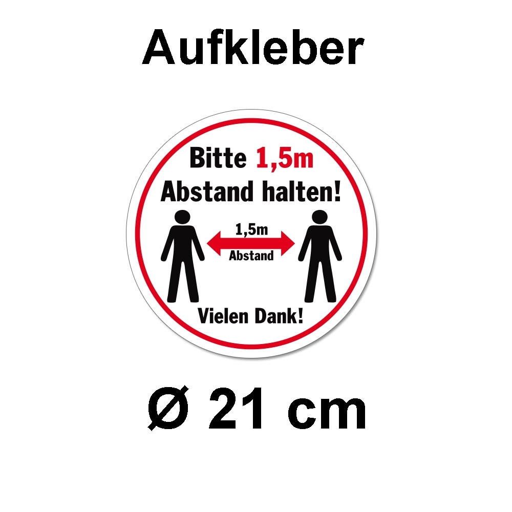 Coronavirus Covid19 runder Fussbodenaufklebermit der Aufschrift "Bitte 1,5m Abstand halten!"